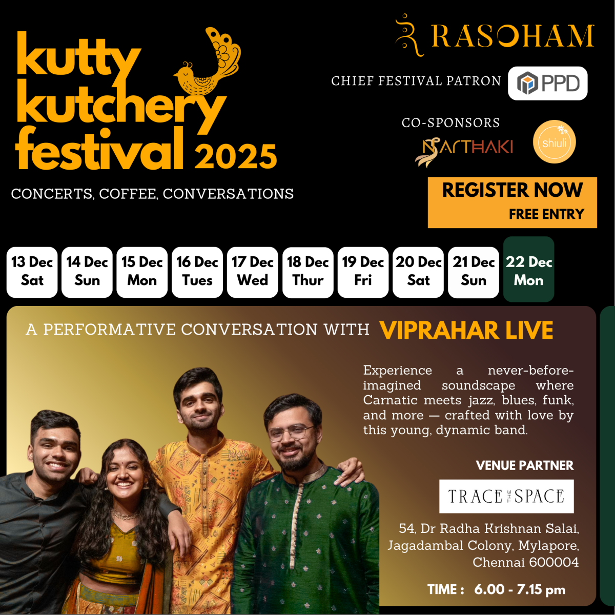 Venue: Trace The Space Address: 54, Dr Radha Krishnan Salai, Jagadambal Colony, Mylapore, Chennai - 600004 Map: https://maps.app.goo.gl/YJpFLZsEGfdeU2RG7 Date : 22 Dec 2025 – 06:00 PM - 07:15 PM