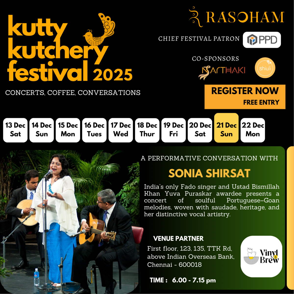 Venue: Rasoham Address: 30, Murrays Gate Rd, Vannia Teynampet, Venus Colony, Teynampet, Chennai - 600018 Map: https://maps.app.goo.gl/5Yymc4vBoLDGh1tv9 Date: 13 Dec 2025 - 06:00 PM - 7:15 PM