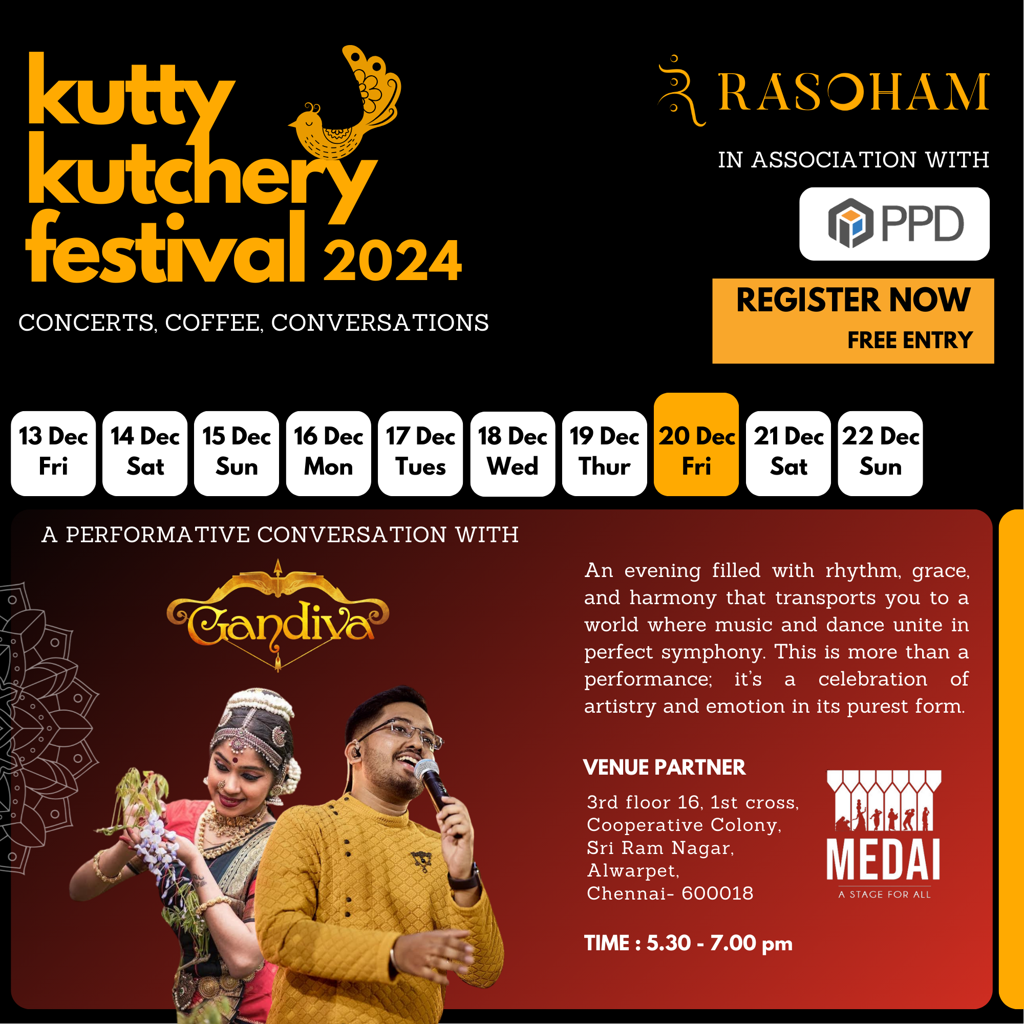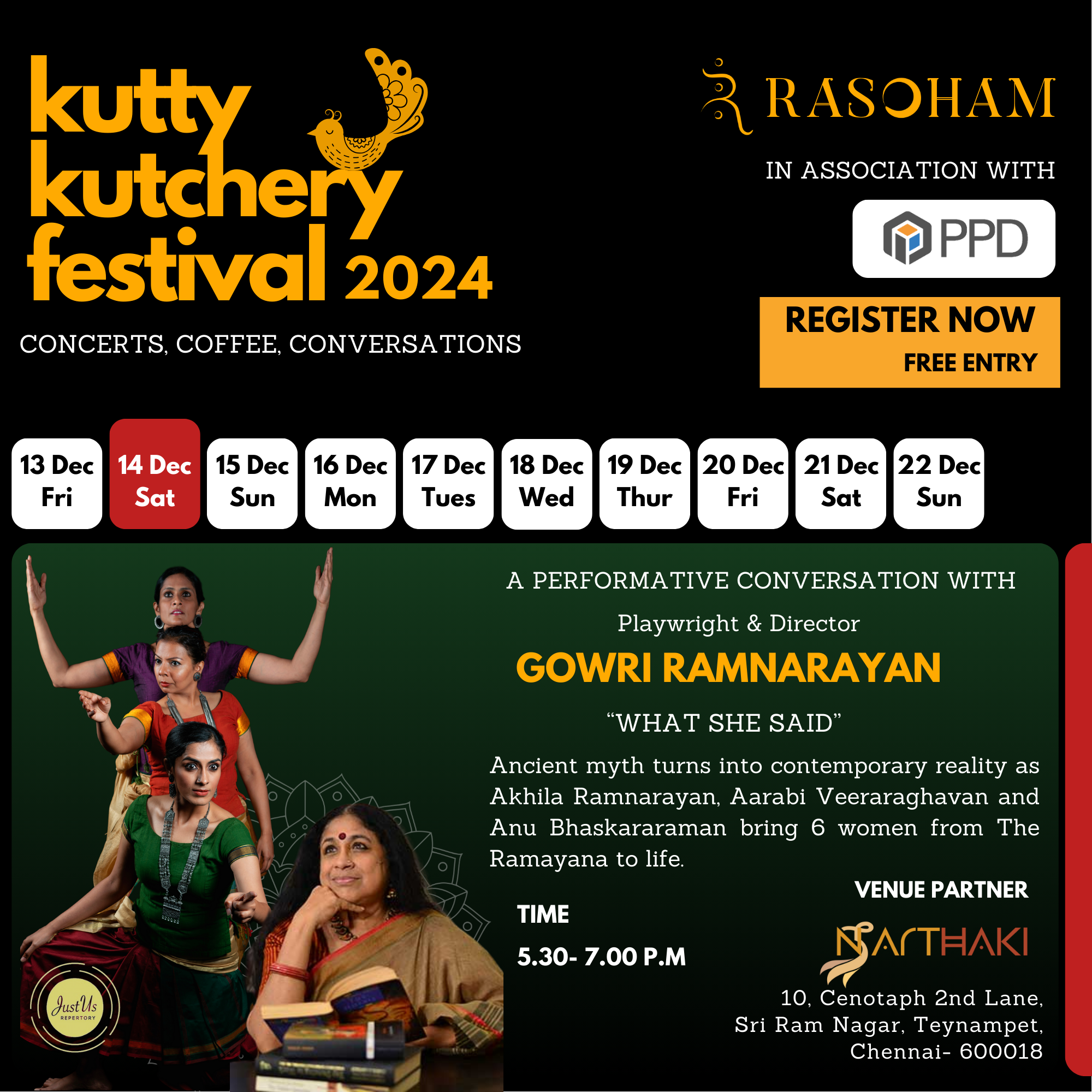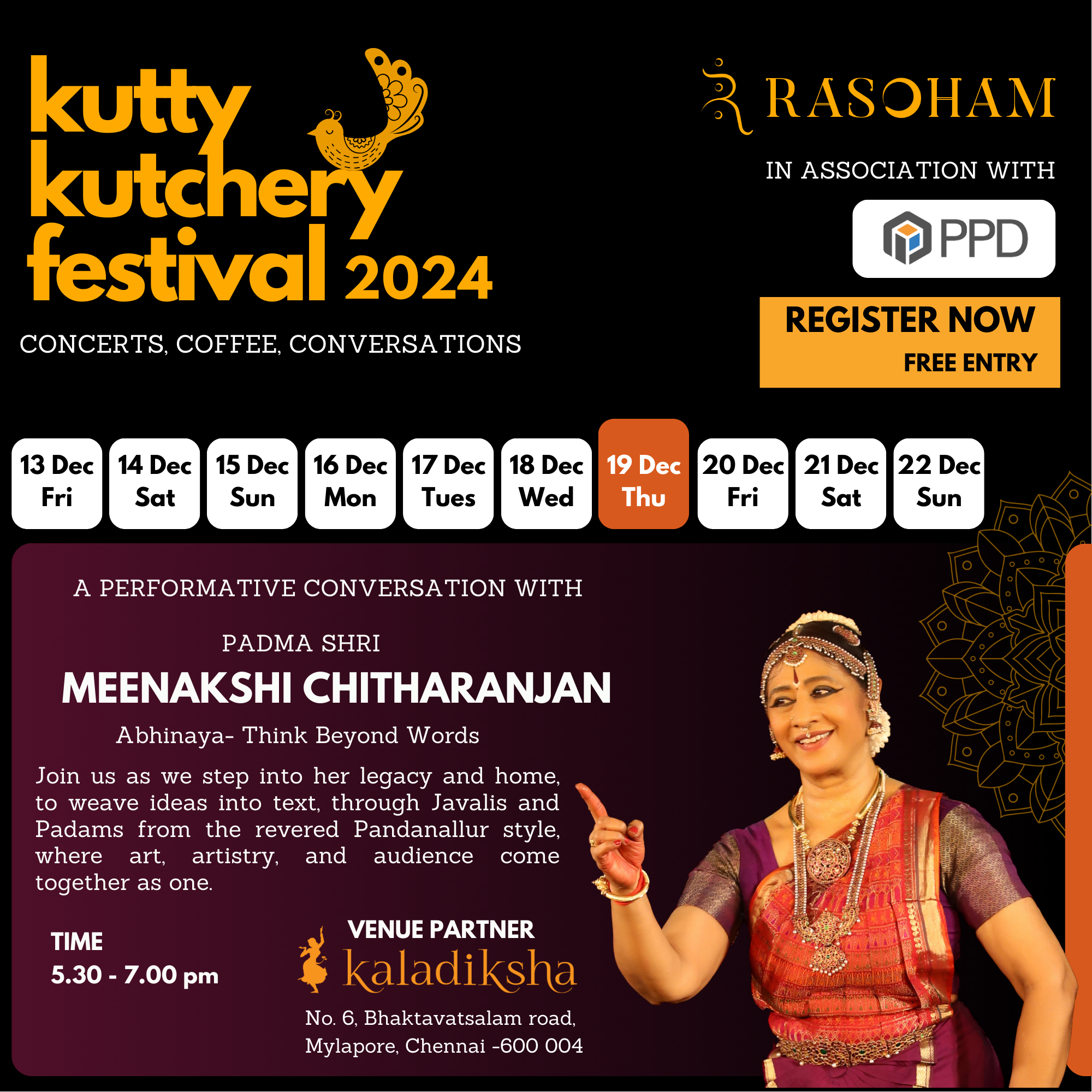 A heartfelt thank you to our ART HOST Venue Partners: RASOHAM Studio, Narthaki Studios, Hanu Reddy Residences, Bharatakalanjali’s TEACH Auditorium, Alliance Française, Goethe-Institut, Kaladiksha, Medai, Rare Lily and KG1 Studios for their incredible support during the Kutty Kutchery Festival 2024.